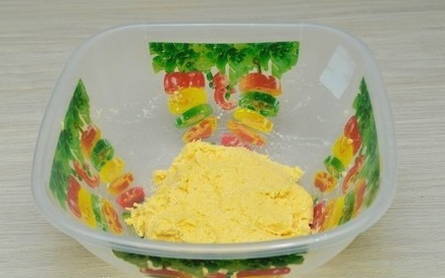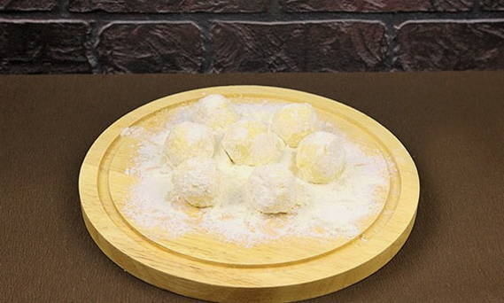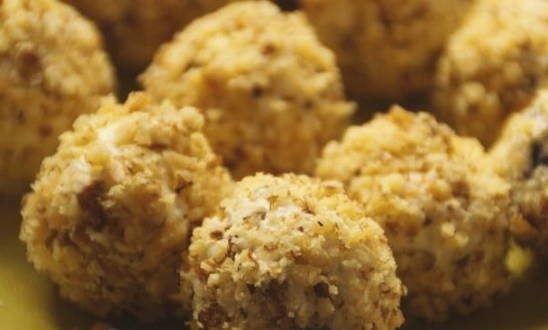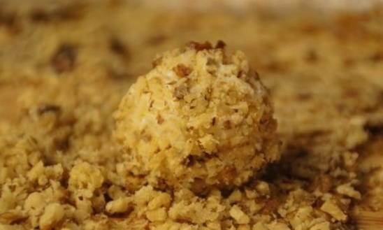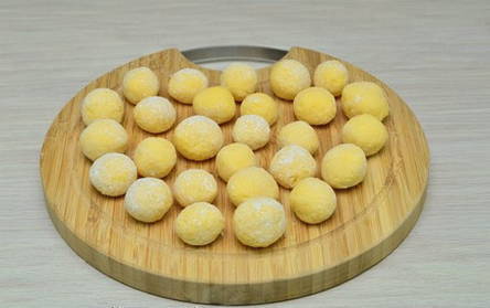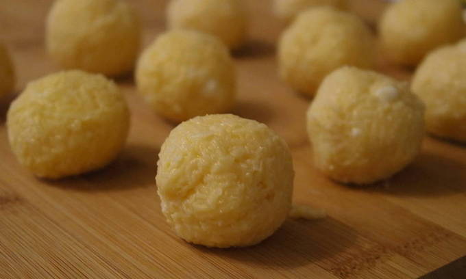 - Van het kaasdeeg maken we met onze handen kleine gladde balletjes. Rol ze met krabschaafsel. We leggen het werkstuk een tijdje in de koelkast.