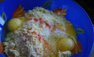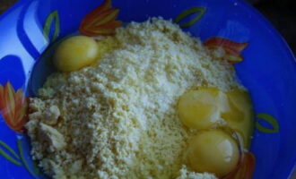 - Voeg 1-2 eetlepels bloem toe aan de ingrediënten. We beginnen de massa grondig te kneden.