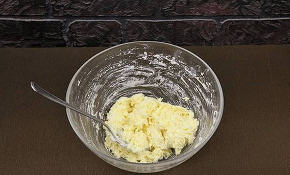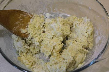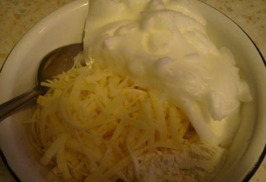 - Meng de kaas met de opgeklopte eiwitten en een beetje bloem. Kneed de massa grondig tot een gladde massa.