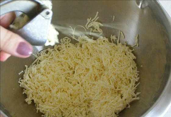- Passeer de kaas door een grove of middelgrote rasp. Doe het ingrediënt in een diepe kom en pers de knoflookteentjes erin.