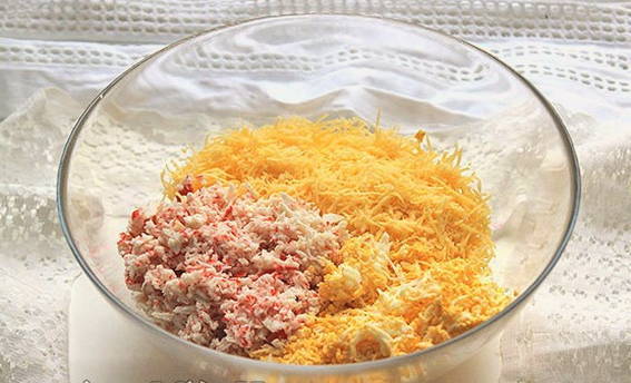 - We combineren de bereide ingrediënten in een gemeenschappelijk bord. We zetten slechts de helft van de krabsticks. Voeg hieraan gehakte knoflook toe.