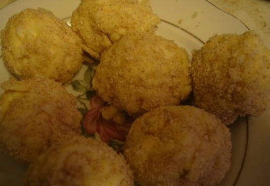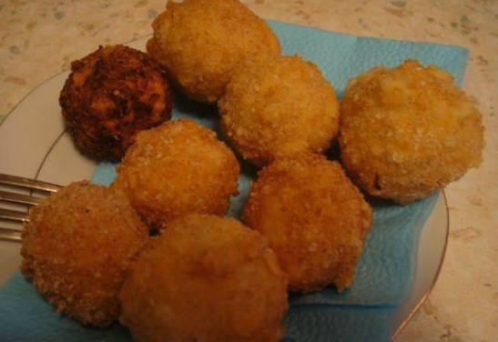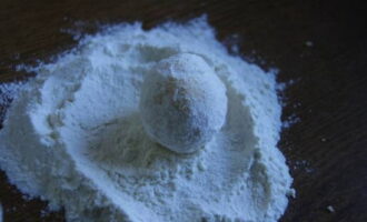 - Van het resulterende deeg vormen we dichte en gladde ballen. We rollen ze door paneermeel.