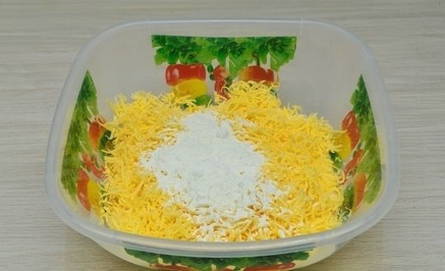 - Bestrooi het eten met een snufje zout en breng op smaak met mayonaise. Kneed de massa grondig tot een gladde massa.
