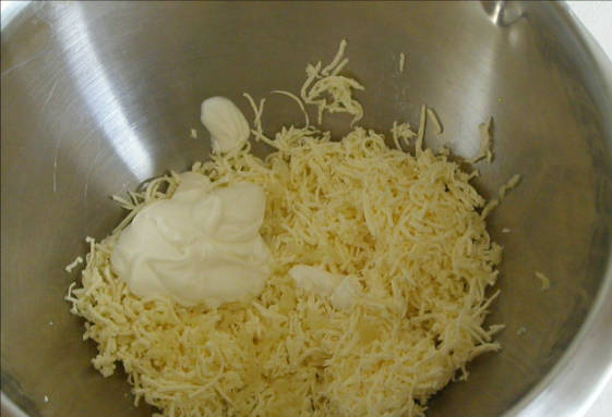 - Giet de massa met mayonaise en begin opnieuw te roeren. Er moet een homogeen kaasdeeg uitkomen.