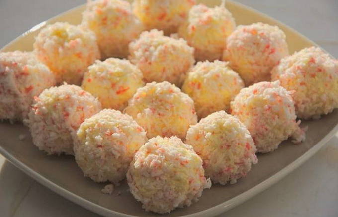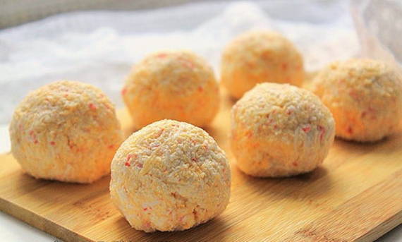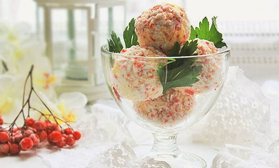 Kaasballen, interessant om te proeven, worden verkregen door toevoeging van krabsticks en aromatische knoflook. Een originele traktatie zal uw menu diversifiëren. Serveer op de feesttafel.