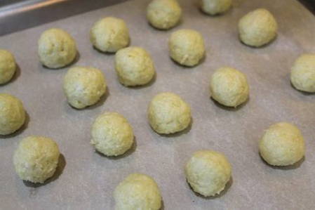 - Rol het deeg in kleine dichte balletjes. Rol ze door de resterende bloem.