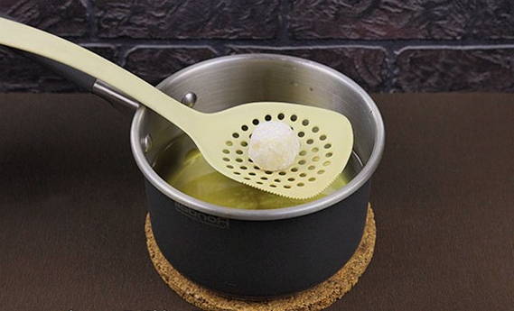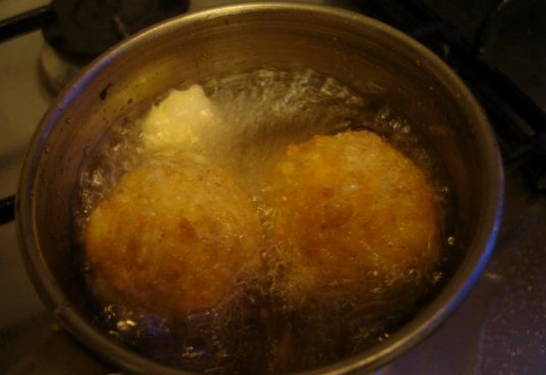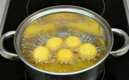 - Giet plantaardige olie in een diepe metalen schaal en verwarm deze. We dompelen de balletjes met een schuimspaan in de kokende vloeistof. Ze mogen de bodem niet raken. Koken gedurende 3-4 minuten.