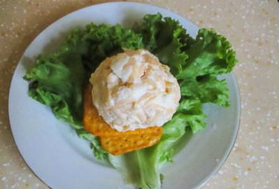 - Een smakelijk voorgerecht is klaar. Serveer gekoelde kaasballetjes met krabsticks.