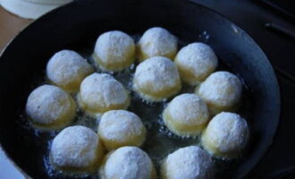 - Giet een grote hoeveelheid plantaardige olie in een pan met een dikke bodem. We laten de ballen in het kokende product zakken en houden ze daar 3-4 minuten.