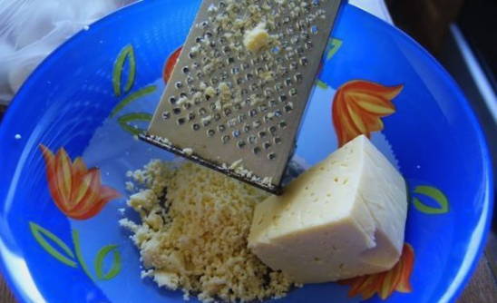 Laten we naar het proces gaan. Wrijf eerst harde kaas. Het is aan te raden hiervoor een fijngetande rasp te gebruiken.