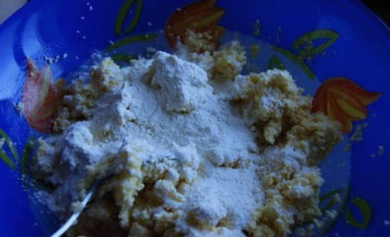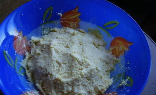 - Meng de kaas met de opgeklopte eiwitten en een beetje bloem. Kneed de massa grondig tot een gladde massa.