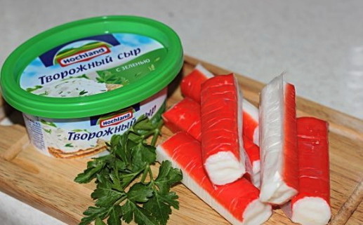 - Laten we de producten voorbereiden. Ontdooi de krabsticks van tevoren. Spoel verse kruiden af met water.