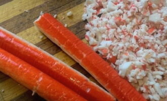- Maal eerst de ontdooide krabsticks. Je kunt ze snijden met een mes of raspen op een grove rasp.