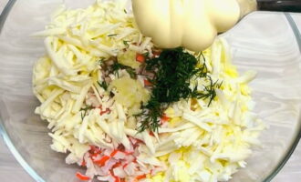 Hak de knoflook en dille. We voegen aromatische kruiden toe aan het gemeenschappelijke bord. Giet mayonaise op de producten en meng grondig.