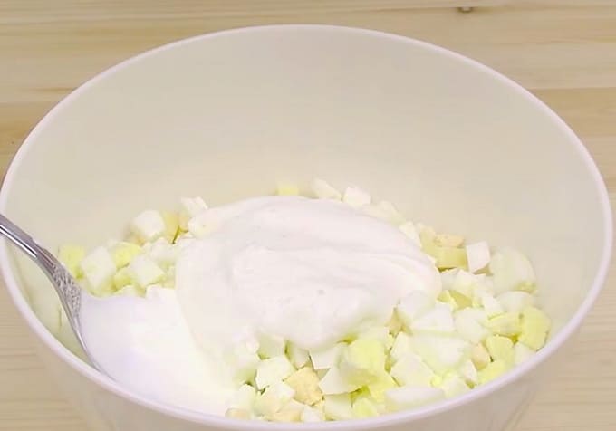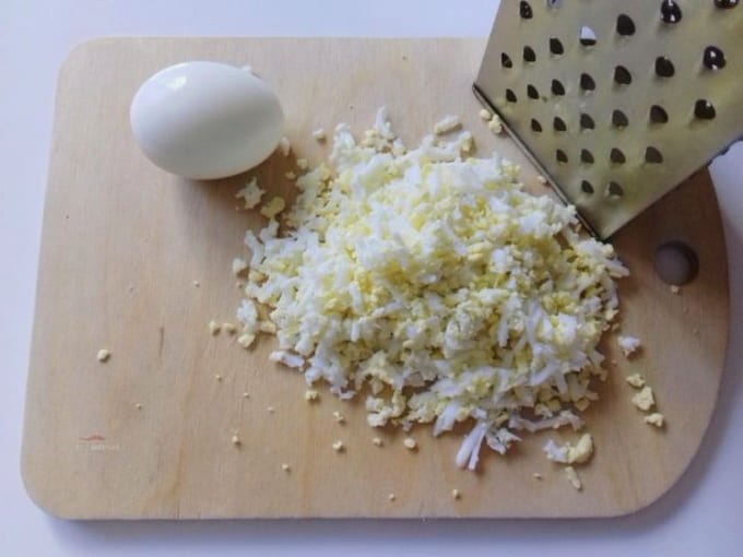 - We halen de eieren uit de schaal. Scheid de eiwitten van de dooiers. We snijden de eerste, raspen de tweede.