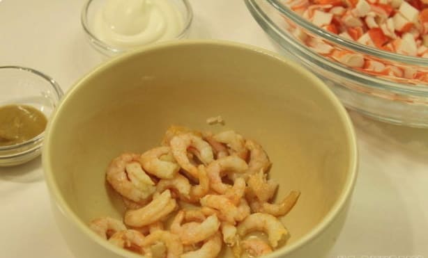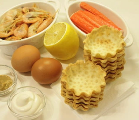 - Laten we de benodigde ingrediënten voorbereiden. Kook kippeneieren van tevoren. Kook de garnalen in gezouten water, zoals aangegeven op de verpakking.