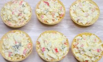 - We combineren de producten en roeren ze met mayonaise. We verspreiden de sappige vulling in de taartjes. We versieren de koude schotel met verse kruiden en serveren. Klaar!