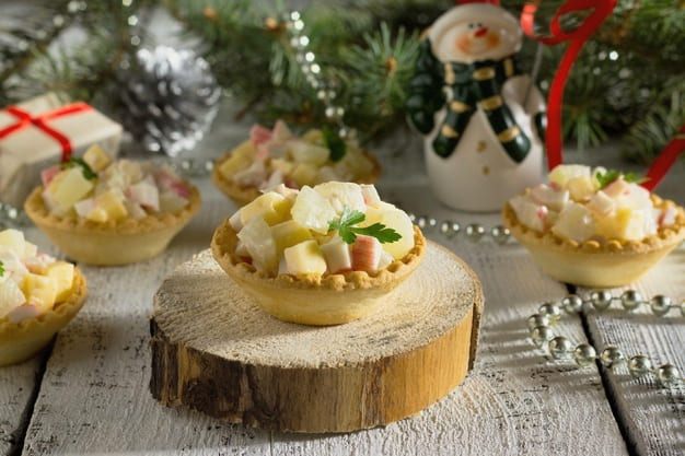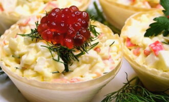 Smakelijke en heldere taartjes zijn geschikt voor een feestelijk diner of een buffettafel. Een koud voorgerecht kan worden bereid met de toevoeging van krabsticks en ingeblikte maïs. Verras uw gasten met een origineel culinair idee.