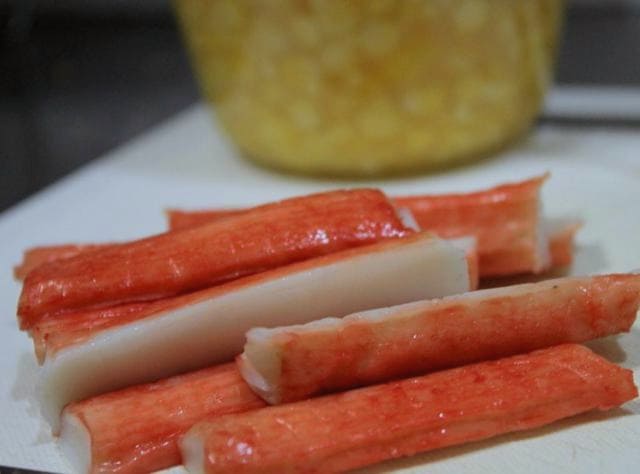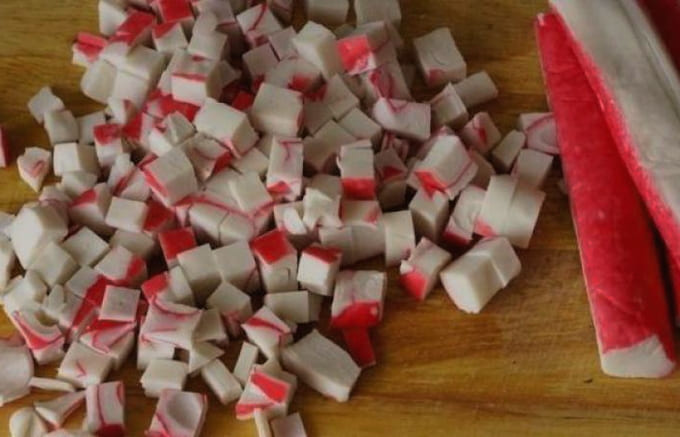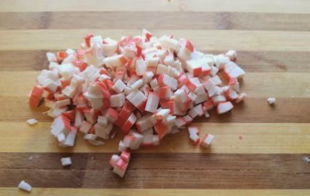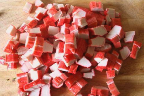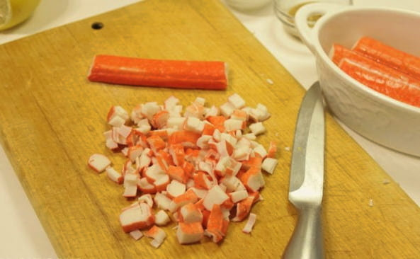 - Krabsticks ontdooien en in kleine blokjes snijden.