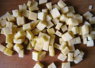 - We snijden de harde kaas op dezelfde manier - snijd hem in kleine blokjes.