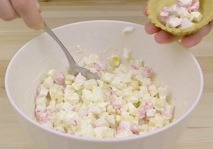 - Combineer al het gehakte voedsel en roer ze met mayonaise, zout en peper. We beginnen met een massa taartjes en serveren ze op tafel. Klaar!