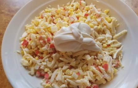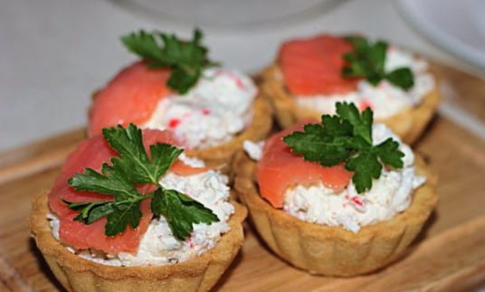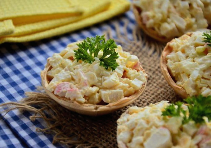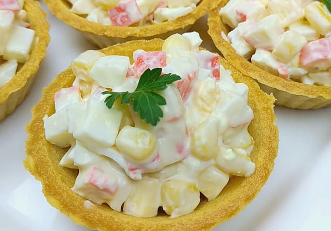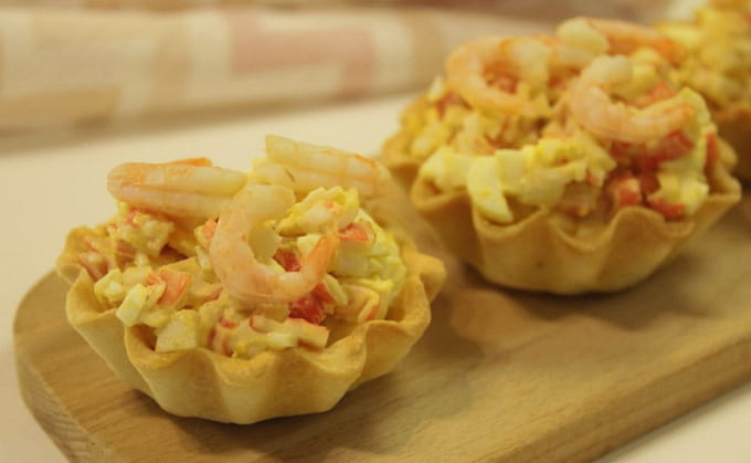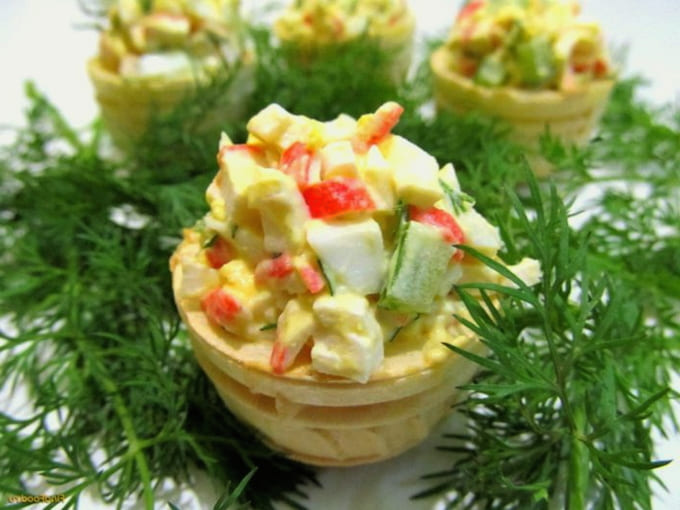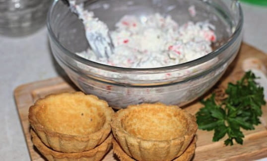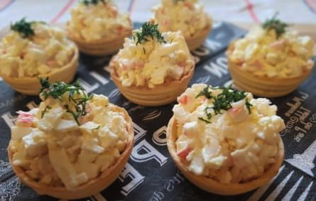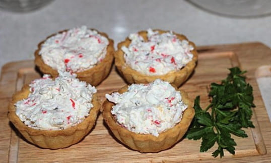 - Tartlets met krabsticks, kaas, ei en knoflook