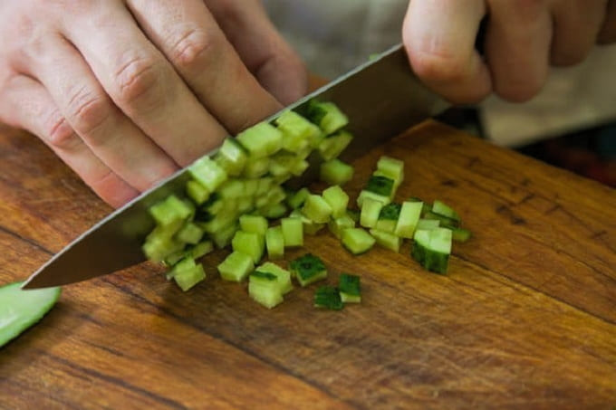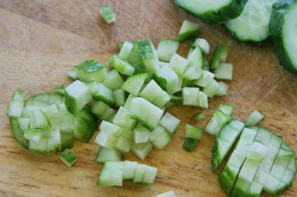 - Giet water over de komkommer en snijd hem in dunne blokjes. Als de schil niet te dik is, kun je deze laten zitten.