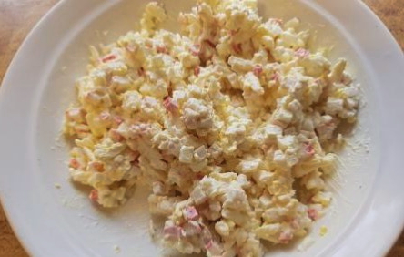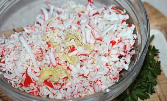 - We verspreiden de gehakte krabsticks en kneden de massa goed zodat alle ingrediënten gelijkmatig worden verdeeld.