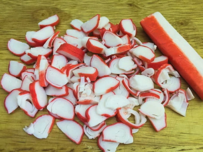 - Ontdooi de krabsticks volledig en snijd ze vervolgens in kleine blokjes.