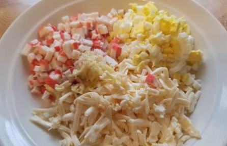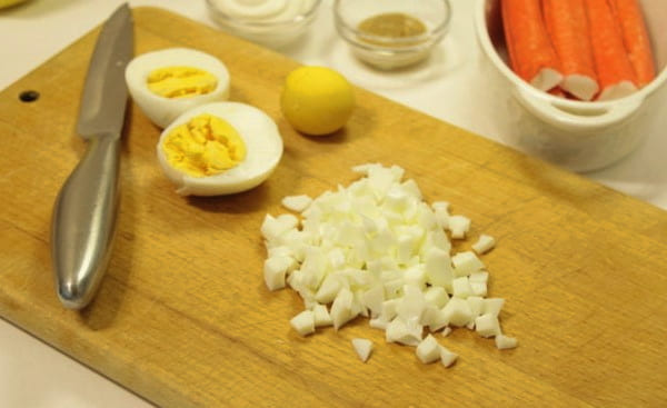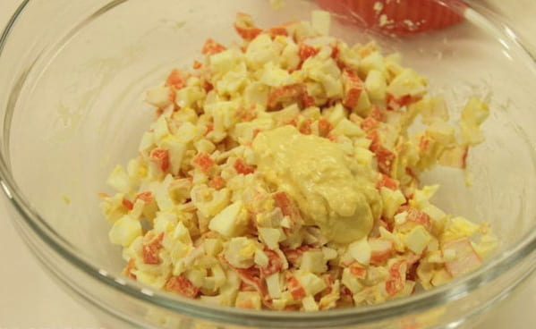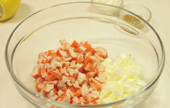 - Combineer krabsticks met gehakte eiwitten in een diep bord.