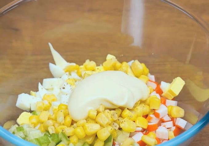 - Doe de voorbereide ingrediënten in een diep bord.Voeg hieraan de maïs uit blik, zout, gemalen zwarte peper en mayonaise toe. Roer de massa goed door en leg deze op de taartjes.