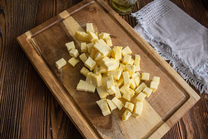 - Vervolgens maken we harde kaas. Het kan worden verdeeld in kleine, gelijke blokjes.
