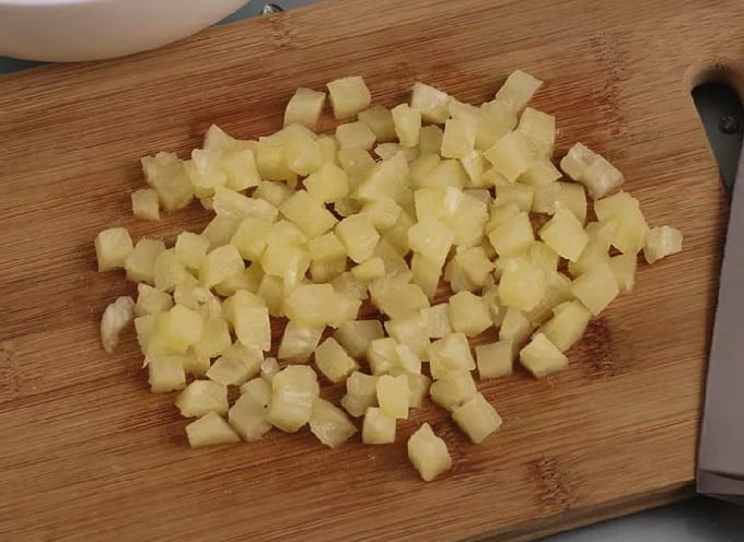 - Giet het sap uit het blik met ananas, hak het product zelf met een mes.