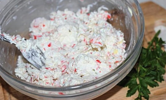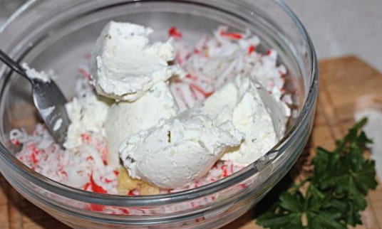 Doe de resulterende massa krabsticks, kaas en kruiden in taartjes. We zetten het gerecht tot het serveren in de koelkast.