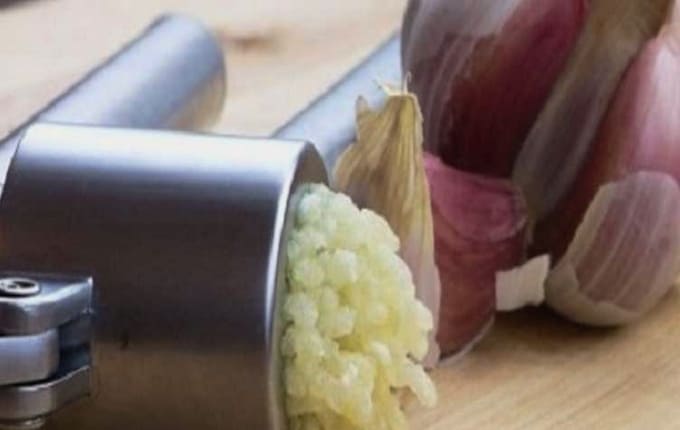 - Pel het teentje knoflook en druk het door een pers in de totale massa.