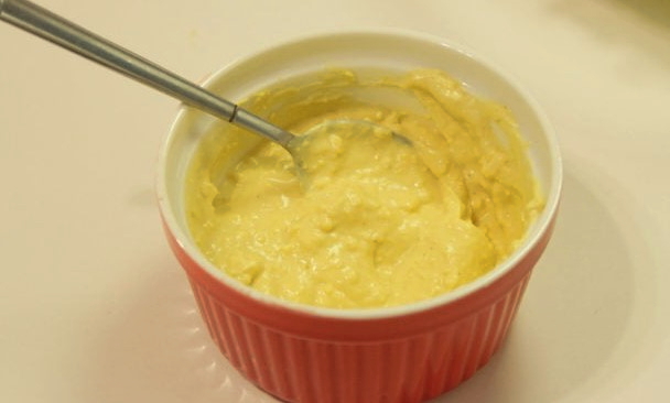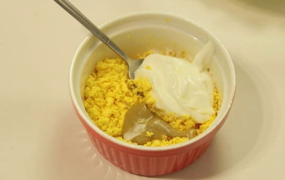 - Meng in een aparte kom de dooiers met zure room, mosterd, zout en zwarte peper.
