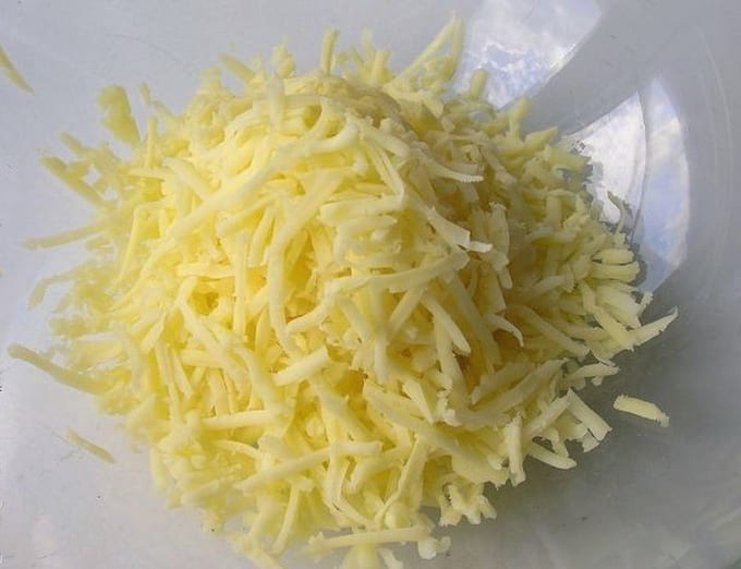 Rasp een stuk harde kaas met grote kruidnagels. We sturen het ingrediënt naar een diep bord.