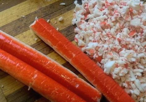 - Krabsticks ontdooien en in kleine blokjes snijden.