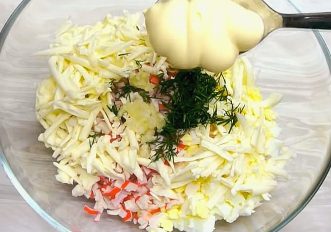 Hak de knoflook en dille. We voegen aromatische kruiden toe aan het gemeenschappelijke bord. Giet mayonaise op de producten en meng grondig.