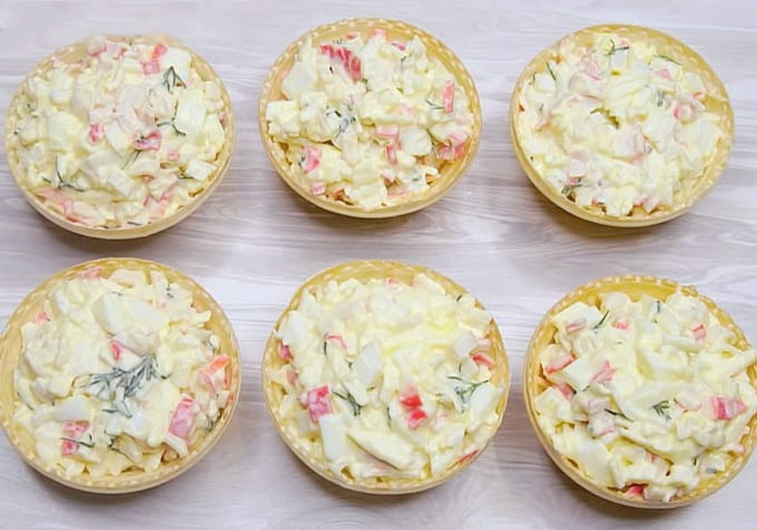 - Tartlets met krabsticks, kaas, ei en knoflook