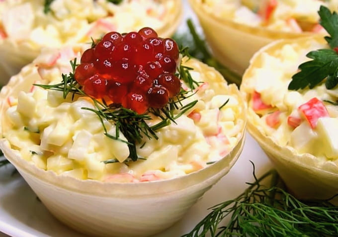 Smakelijke en heldere taartjes zijn geschikt voor een feestelijk diner of een buffettafel. Een koud voorgerecht kan worden bereid met de toevoeging van krabsticks en ingeblikte maïs. Verras uw gasten met een origineel culinair idee.