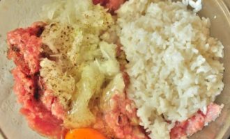 Eerst moet je al het voorbereidende werk doen. Zorg ervoor dat je de rijst afspoelt en kook de granen tot ze half gaar zijn, en kook ook het gehakt als je het zelf doet. Meng vervolgens de afgekoelde rijst, het gehakt, de eieren en het zout in een diepe kom. Je moet alles goed mengen. Hak de ui op een rasp of in een blender en voeg toe aan het gehakt.