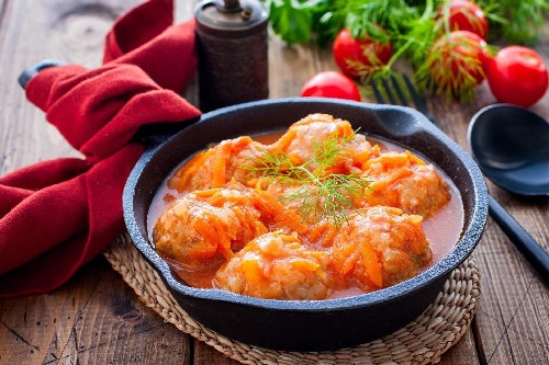 - Giet de saus in een koekenpan met gehaktballen, bedek de pan met gehaktballen met een deksel en laat ze een half uur sudderen tot ze gaar zijn. Serveer kant-en-klare gehaktballen met een bijgerecht naar smaak.
