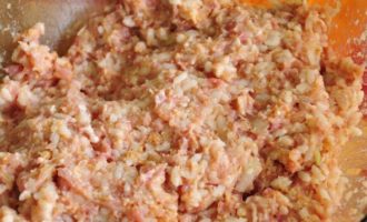 - Als de uien glazig zijn, zet je het vuur uit en laat je de wortels afkoelen. Doe vervolgens een mengsel van varkensvlees en rundergehakt in een diepe kom, voeg wortelgroenten, zout en een ei toe. Meng de ingrediënten goed door elkaar en kneed tot een homogeen gehakt.