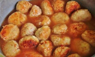 - Giet de toekomstige jus in een koekenpan met gehaktballen en champignons en laat het gerecht veertig minuten op laag vuur sudderen, waarbij je de gehaktballen regelmatig omdraait.