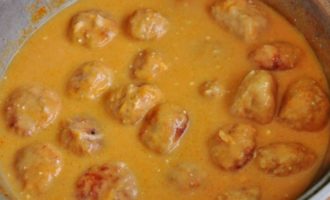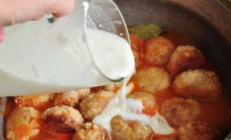 Giet de zure roomsaus in een pan met gehaktballen, meng voorzichtig en laat de gehaktballen ongeveer twintig minuten of een half uur sudderen onder een gesloten deksel.