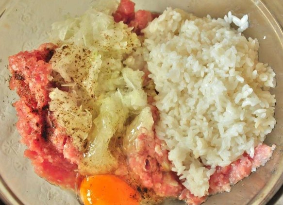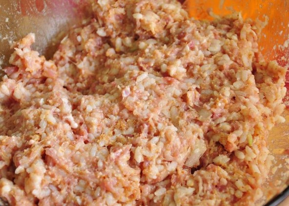 Eerst moet je al het voorbereidende werk doen. Zorg ervoor dat je de rijst afspoelt en kook de granen tot ze half gaar zijn, en kook ook het gehakt als je het zelf doet. Meng vervolgens de afgekoelde rijst, het gehakt, de eieren en het zout in een diepe kom. Je moet alles goed mengen. Hak de ui op een rasp of in een blender en voeg toe aan het gehakt.