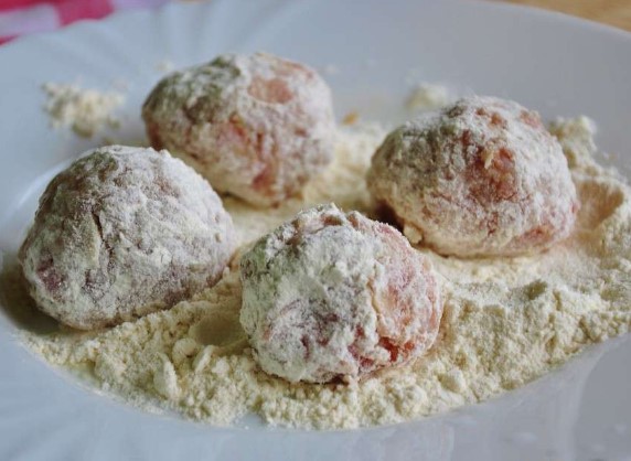 Vorm met natte handen balletjes zodat het gehakt niet gaat plakken. Dompel de balletjes vervolgens in tarwebloem om te voorkomen dat ze tijdens het frituren hun vorm verliezen.