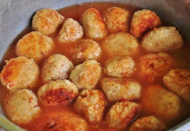 - Zodra de jus kookt, leg je de visgehaktballetjes daar voorzichtig en dek je de kom af met de schaal met een deksel. Laat de visgehaktballetjes veertig minuten onder het deksel sudderen, controleer soms de consistentie van de jus en de bereidheid van de gehaktballen.