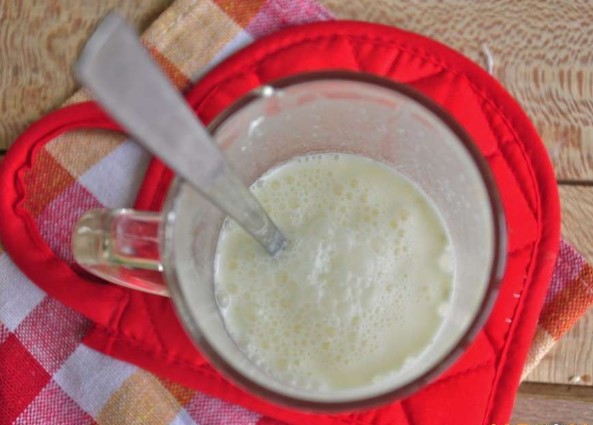 Terwijl de gehaktballen stoven, verdun de zure room in een half glas water, meng goed.